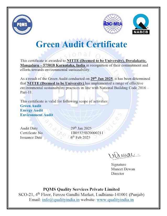 Nitte (Deemed to be University), Mangaluru, was awarded the National Accreditation Board for Certification Bodies (NABCB) certification for comprehensive Green, Energy and Environment audit.