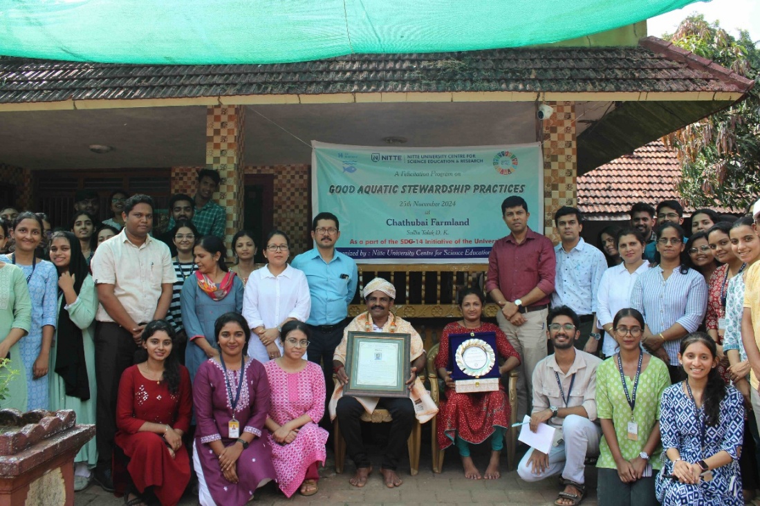 Under the Sustainable Development Goals (SDG) initiative of Nitte University, NUCSER organized a program on 25th November 2024 to felicitate Mr. CK Naveenchandra for ‘Good Aquatic Stewardship Practices’ at Chathubai Farmland, Sullia Taluk, DK.