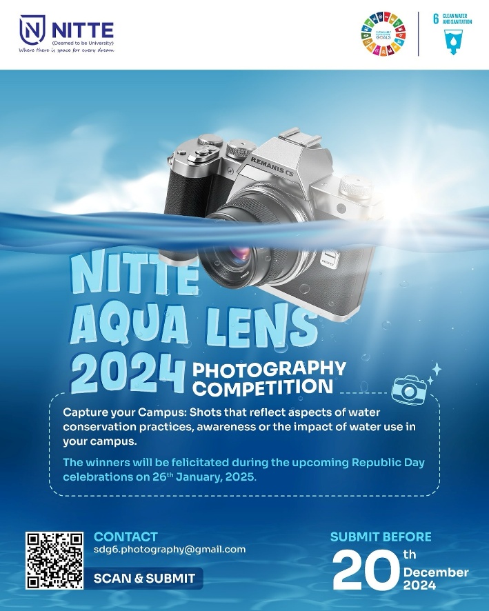 NITTE AQUA LENS 2024 Photography Competition invited participants to capture the essence of water conservation on campus through the lens of their cameras. The competition aimed to raise awareness about the importance of preserving water resources by showcasing impactful visuals that highlighted water-saving practices, conservation efforts, and the effects of water management.