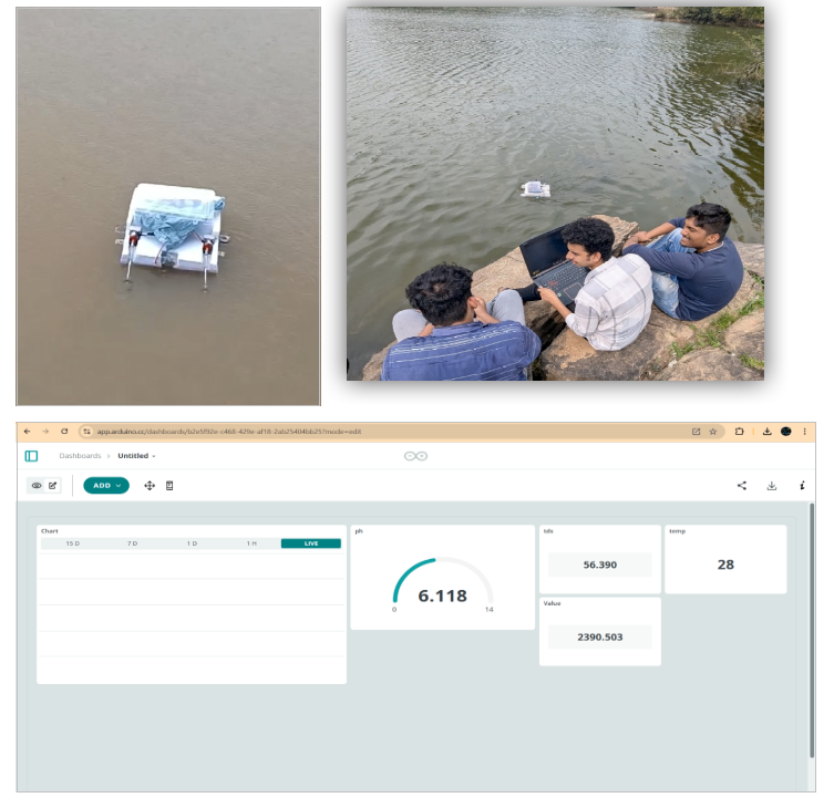 Nitte DU developed “Unmanned vessel for water pollution monitoring”. Water quality monitoring is essential for environmental preservation and safe water use. Current systems allow real-time, automated assessments of parameters such as temperature, turbidity, pH, and total dissolved solids (TDS). IoT-based system for continuous, remote water quality monitoring. Sensors wirelessly send data to the Arduino Cloud, accessible via desktop or mobile devices. The system uses an ultrasonic A220YUW sensor to detect floating waste and visual pollution. An autonomous unmanned vehicle, controlled by an Arduino Nano RP2040, maps water quality variations across rivers, lakes, and ponds, initiating corrective actions when safety thresholds are exceeded.