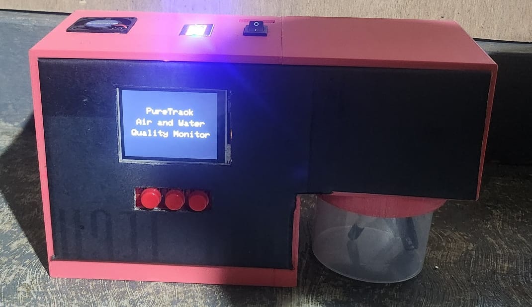 Nitte DU has developed PureTrack, a compact, real-time air and water quality monitoring system. It detects air pollutants such as carbon monoxide, LPG, ozone, smoke, and methane, along with temperature, humidity, and dust levels. For water, it measures pH, turbidity, TDS, and temperature. Sensors interface with an ESP32 microcontroller, displaying data on a TFT LCD. Real-time updates are accessible via the Blynk app, with simple Wi-Fi setup through an onboard manager. PureTrack offers a user-friendly solution for pollution monitoring, enabling timely actions to protect public health and ensure environmental safety.