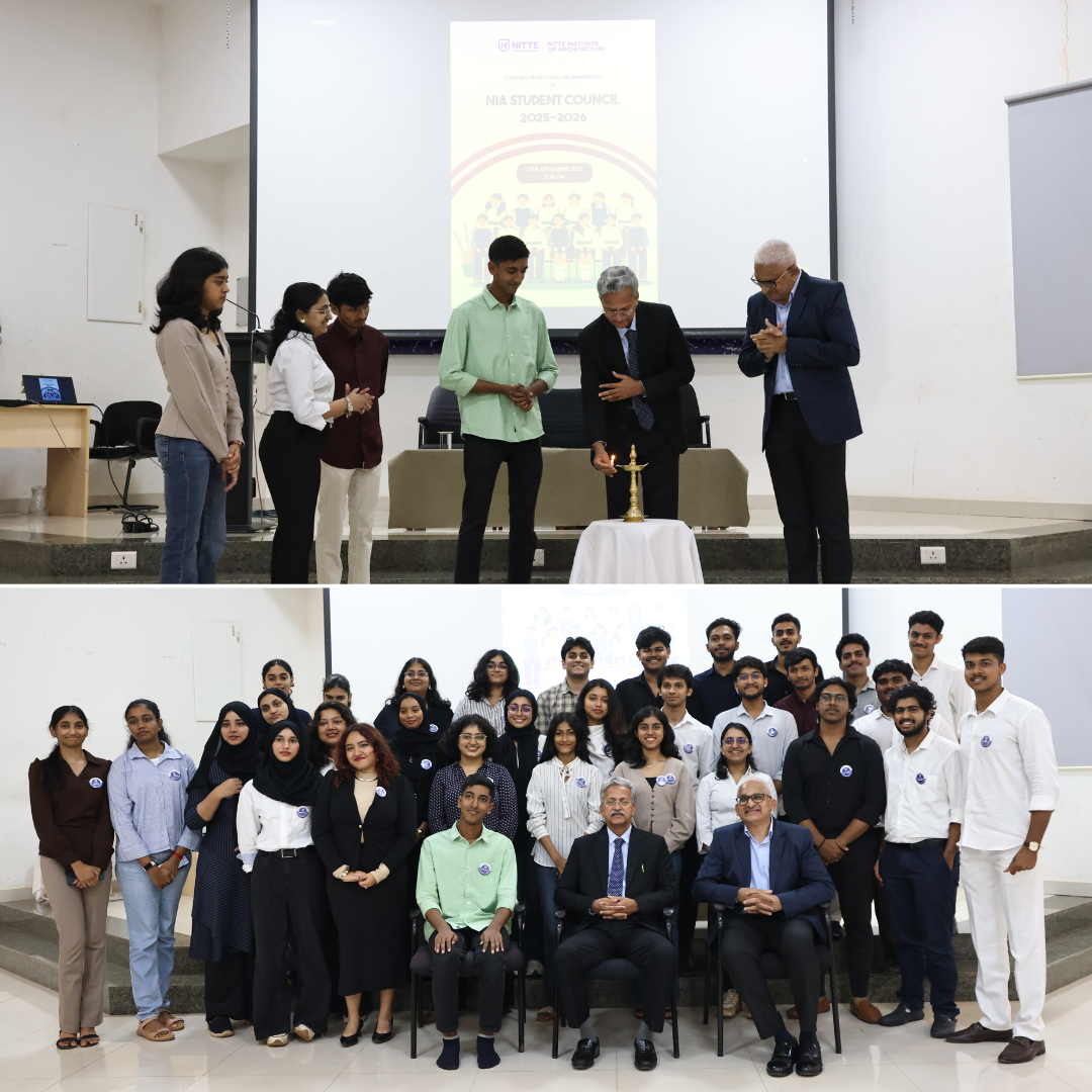 The Nitte Institute of Architecture inaugurated the Student Council for 2025-26 on 19th September 2025 in a ceremony that celebrated leadership and student representation. The event began with the lighting of the lamp by the Vice Chancellor, Prof. (Dr.) M. S. Moodithaya, Director of NIA, Prof. Vinod Aranha and Council members, symbolizing wisdom and knowledge.