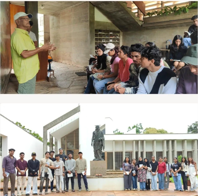 Semester 8 architecture students, accompanied by two faculty, embarked on a study trip to Bangalore, exploring urban housing and landscape design through real-world case studies. students engaged with experts like Bijoy Ramachandran and Sanjay Mohe, visited IIM Bangalore, Good Earth, Total Environment, Brigade Gateway, and explored Titan Integrity Campus, gaining insights into sustainable strategies, urban planning, and spatial innovation. This immersive experience enriched their academic journey, preparing them for upcoming studio
