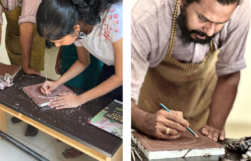 A hands-on Kaavi Art workshop was conducted by renowned artist Janardhan Havanje. Rooted in the coastal heritage of Karnataka, Kaavi art is known for its intricate patterns etched onto red oxide backgrounds, traditionally found in temples and heritage structures. The workshop offered students a rare opportunity to learn directly from a practicing artist and understand the cultural significance, techniques, and materials involved in this unique mural tradition. Students engaged in creating their own Kaavi artworks under Janardhan’s guidance, exploring the process of sketching, etching, and developing symbolic compositions. The session was both informative and immersive, encouraging appreciation for indigenous art and craftsmanship. Through this enriching experience, students gained a deeper understanding of Indian visual culture while also exploring ways to creatively reinterpret traditional practices in contemporary contexts.