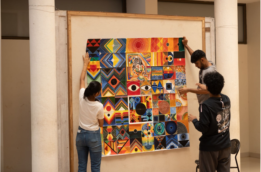 To kickstart the academic semester with creativity and collaboration, students participated in an inspiring workshop centered on the works of renowned artist S.H. Raza. Curated and conducted by artist Anil Devadiga and the faculty team, the session introduced students to Raza’s philosophy, his iconic use of the bindu, geometry, and the emotional power of color. Through guided discussions and hands-on exploration, students interpreted Raza’s ideas in their own unique styles. The workshop culminated in the creation of a large installation art panel—a vibrant collage made from individual student artworks assembled into one collective piece. This collaborative installation not only reflected the diverse expressions of each participant but also symbolized unity, creativity, and a shared journey into artistic exploration. The final artwork now stands as a powerful representation of the students’ collective energy and marks a meaningful and inspiring start to the semester.