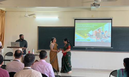 The programme commenced with an insightful session on Sahaja Yoga delivered by Mrs. Padama Gangadhar. The session introduced participants to the principles and practice of Sahaja Yoga, emphasizing its relevance in promoting mental clarity, emotional balance, and overall well-being. Participants were encouraged to integrate the practice into their daily routines to enhance inner stability and stress management.