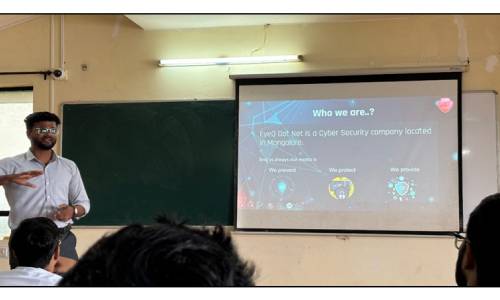 The Department of Cyber Security, NMAMIT, in collaboration with EyeQDotNet, organised a seminar to provide students with valuable insights into cybersecurity concepts, ethical hacking, and career pathways in the domain. The session was conducted by Mr. Mohammed Sheikh Nihal, CEO of EyeQDotNet, along with his team, for the second-year Cybersecurity students. Key topics included cybersecurity fundamentals, ethical hacking principles, a live SQL injection demonstration, and career guidance in the field. Students gained awareness of the significance of ethics, hands-on learning, and interview readiness. The session also underscored EyeQDotNet’s mission to “Prevent, Protect, and Provide.” An engaging Q&A segment enabled students to clarify their queries and receive practical insights. The event concluded with a vote of thanks by Mr. Yashraj, followed by words of appreciation from Dr. Roshan Fernandes to the EyeQDotNet team for their informative and interactive session.