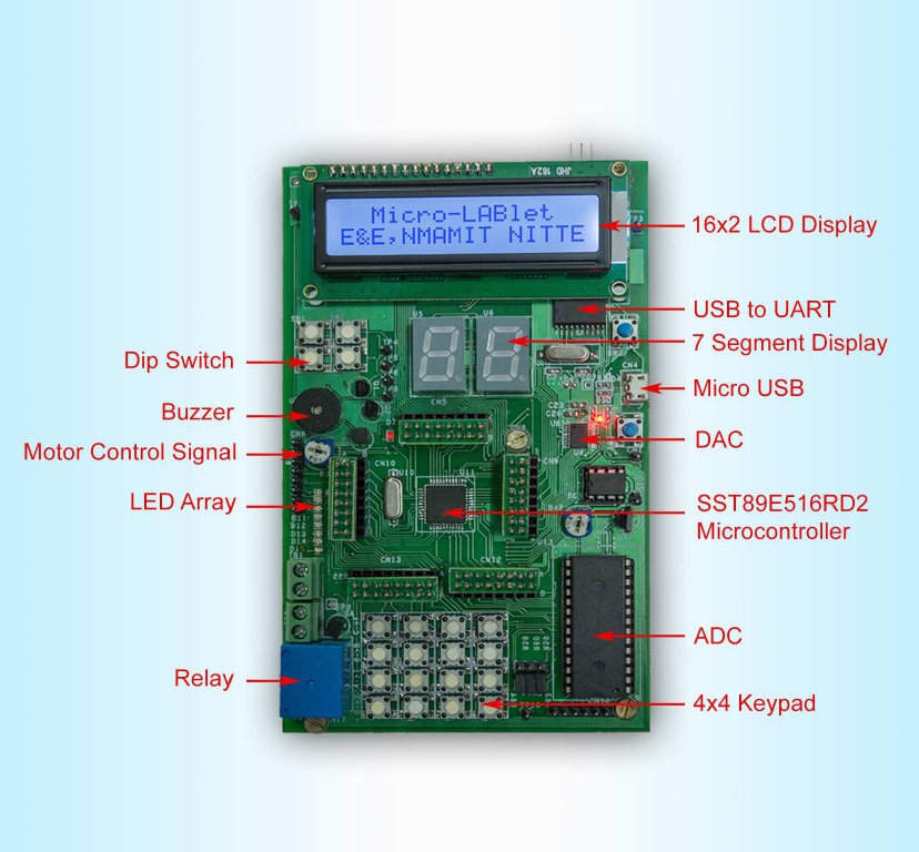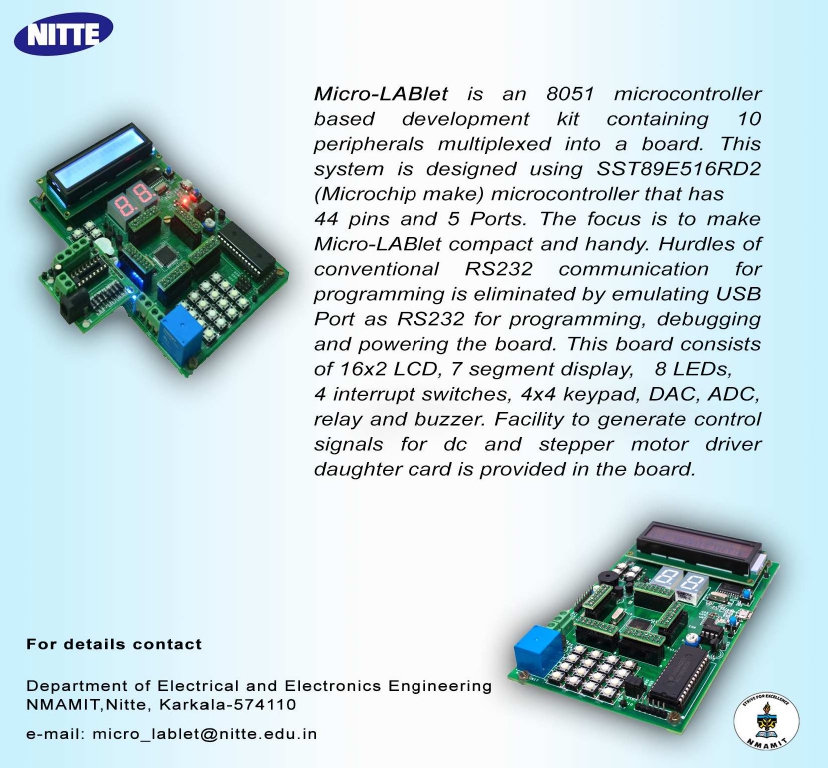 | 1 | Micro-LABlet, 8051 based laboratory kit. Portable USB powered kit with 10 number of on-board hardware interfacing facility. |
