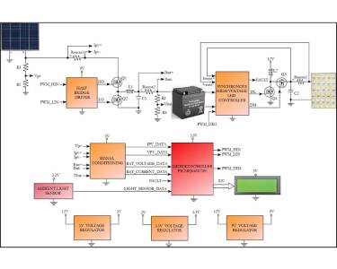 Solar-powered street lighting system utilises a 75W solar panel to charge a 12V battery through a buck converter. A half-bridge driver controls the buck converter, ensuring efficient battery charging. The solar and battery’s voltage and current are measured using a potential divider and sense resistor. A synchronous high-voltage LED controller is used to power the LEDs, allowing control of their intensity. An Ambient Light Sensor (ALS) is used to detect the surrounding light conditions and the information is sent to PIC microcontroller. Based on ambient light levels, solar parameters, and battery status, the microcontroller adjusts the street light’s brightness, ensuring optimal operation. The system dynamically controls the LEDs’ brightness, conserving energy during bright conditions while maintaining illumination during low-light conditions, thus enhancing energy efficiency and sustainability in outdoor lighting applications.