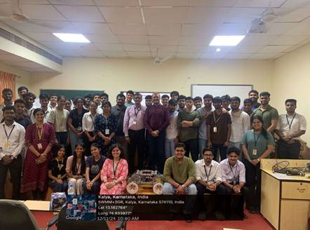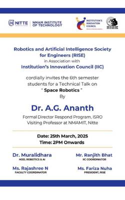 The Institution’s Innovation Council (IIC), in collaboration with the Robotics and Artificial Intelligence Society for Engineers (RISE), organized a technical talk on “Space Robotics” on 25 March 2025 at NMAMIT, featuring Dr. A.G. Ananth, Former Director of ISRO’s Respond Program and Visiting Professor at NMAMIT. Dr. Ananth provided valuable insights into ISRO’s advancements in space technology, the role of robotics in exploration, rocket and satellite systems, deep space missions like Chandrayaan, and innovations such as space-bound robo dogs.