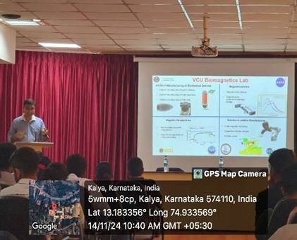 On 14 November 2024, Shambhavi Hall hosted an insightful technical talk by Dr. Ravi Hadimani, Associate Professor and Director of the Biomagnetics Laboratory at Virginia Commonwealth University, on the topic “Advancing Neurological and Psychiatric Care: Insights into Magnetic Brain Stimulation and Emerging Technologies.” The session, attended by faculty, students, and distinguished guests, explored the science, applications, and future potential of Magnetic Brain Stimulation (MBS), particularly Transcranial Magnetic Stimulation (TMS), in treating conditions like depression, Parkinson’s disease, stroke recovery, and chronic pain. Dr. Ravi highlighted the mechanisms behind MBS, its safety profile, and its effectiveness as a non-invasive alternative for patients who do not respond well to conventional treatments.