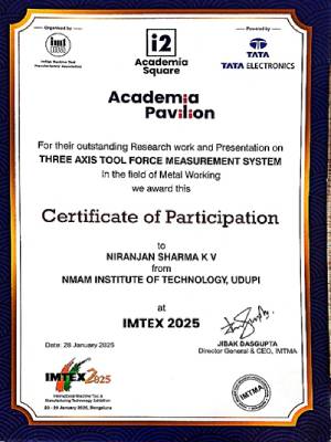 The research project titled “Three Axis Tool Force Measurement System” has been recognised as one of the top ten research projects in the field of Manufacturing at IMTEX 2025.