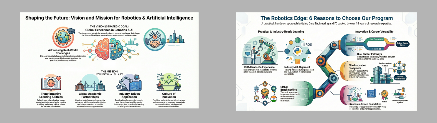 The department offers UG & PG program on Robotics and AI with an intake of 60 and 18 respectively from the AY 2026-27. The department delivers an industry-relevant curriculum designed to meet the dynamic needs of the robotics and AI sectors. What truly distinguishes our department is a 100% hands-on learning approach, supported by cutting-edge infrastructure and an environment that encourages real-world problem-solving and innovation.